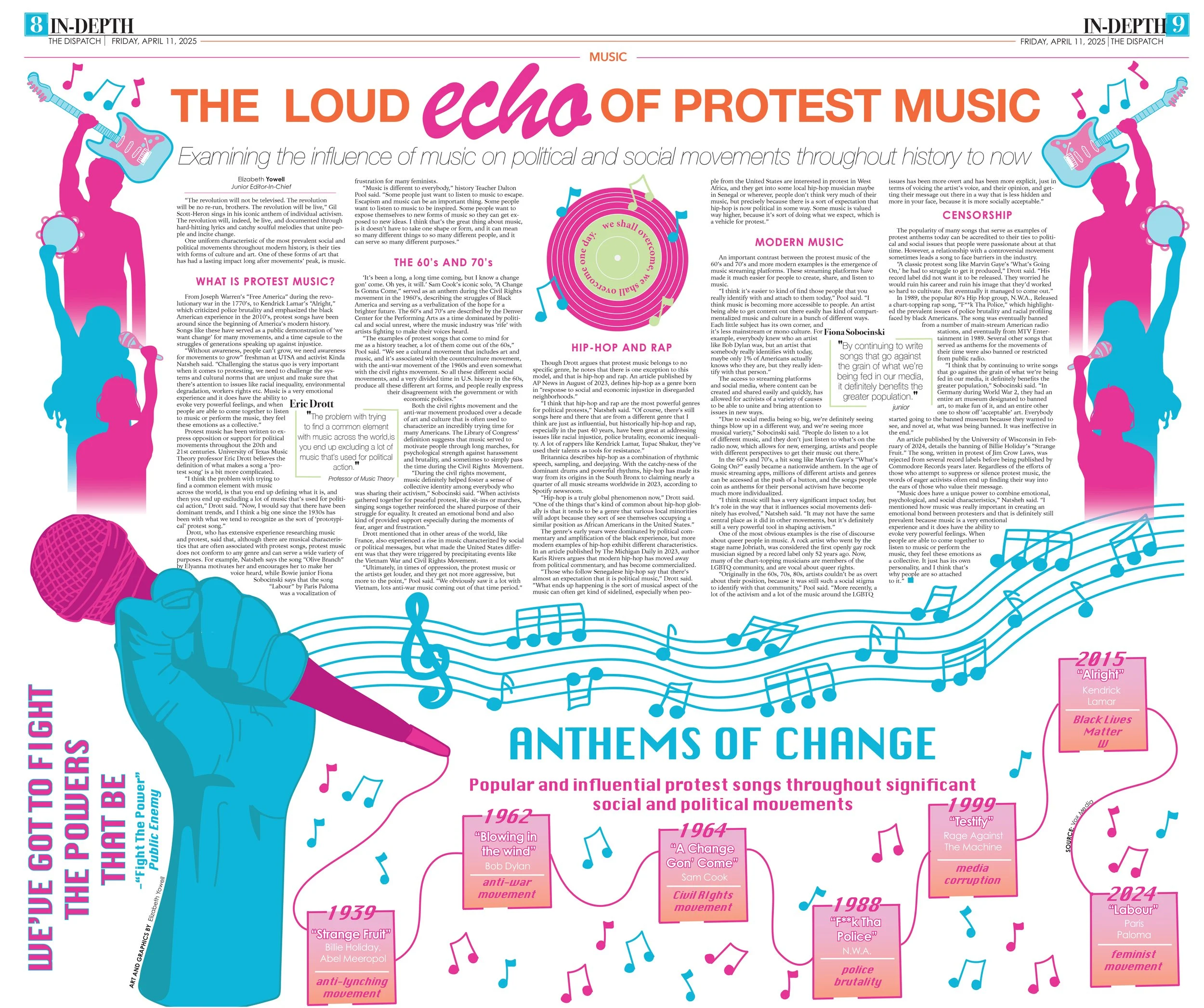 This is by far my favorite page that I’ve done, I was really excited about the story subject itself and ended up incredibly proud of the way that translated in the design. I wanted this design to encapsulate the passion and power that are present in music and protest. An advantage I have when designing is being able to create my own art and graphics for the page, this allows me to have more freedom. Here I used that advantage to combine iconic symbols of protest and music.