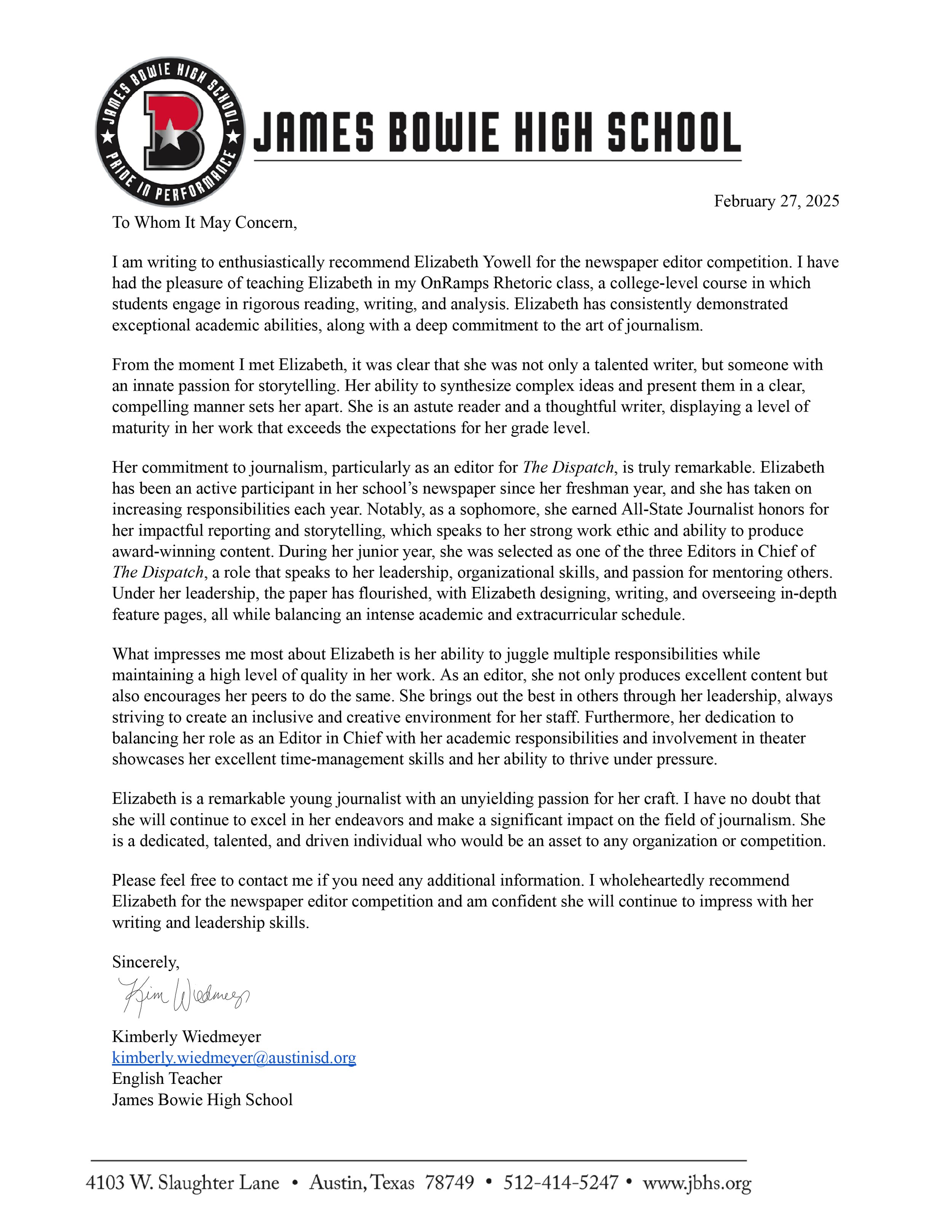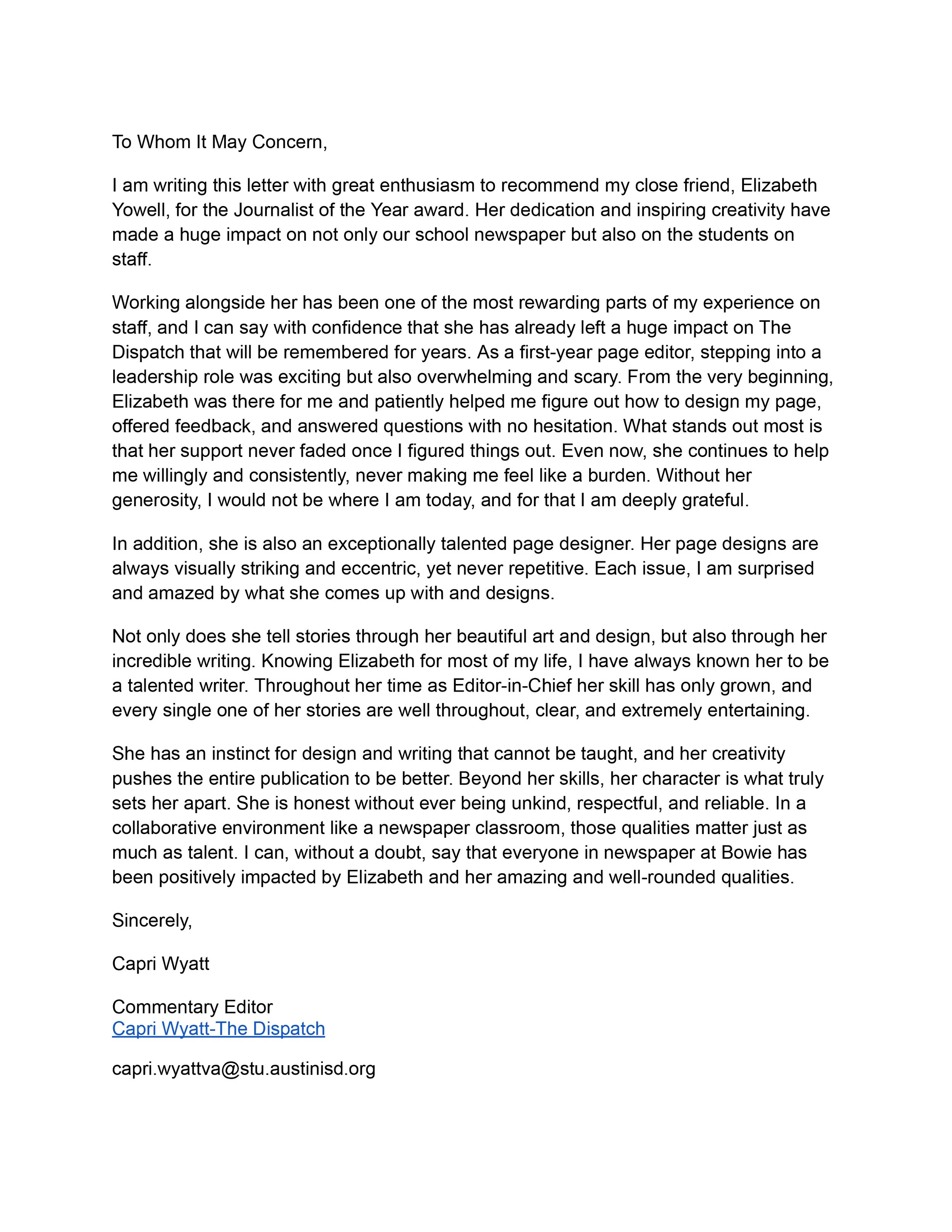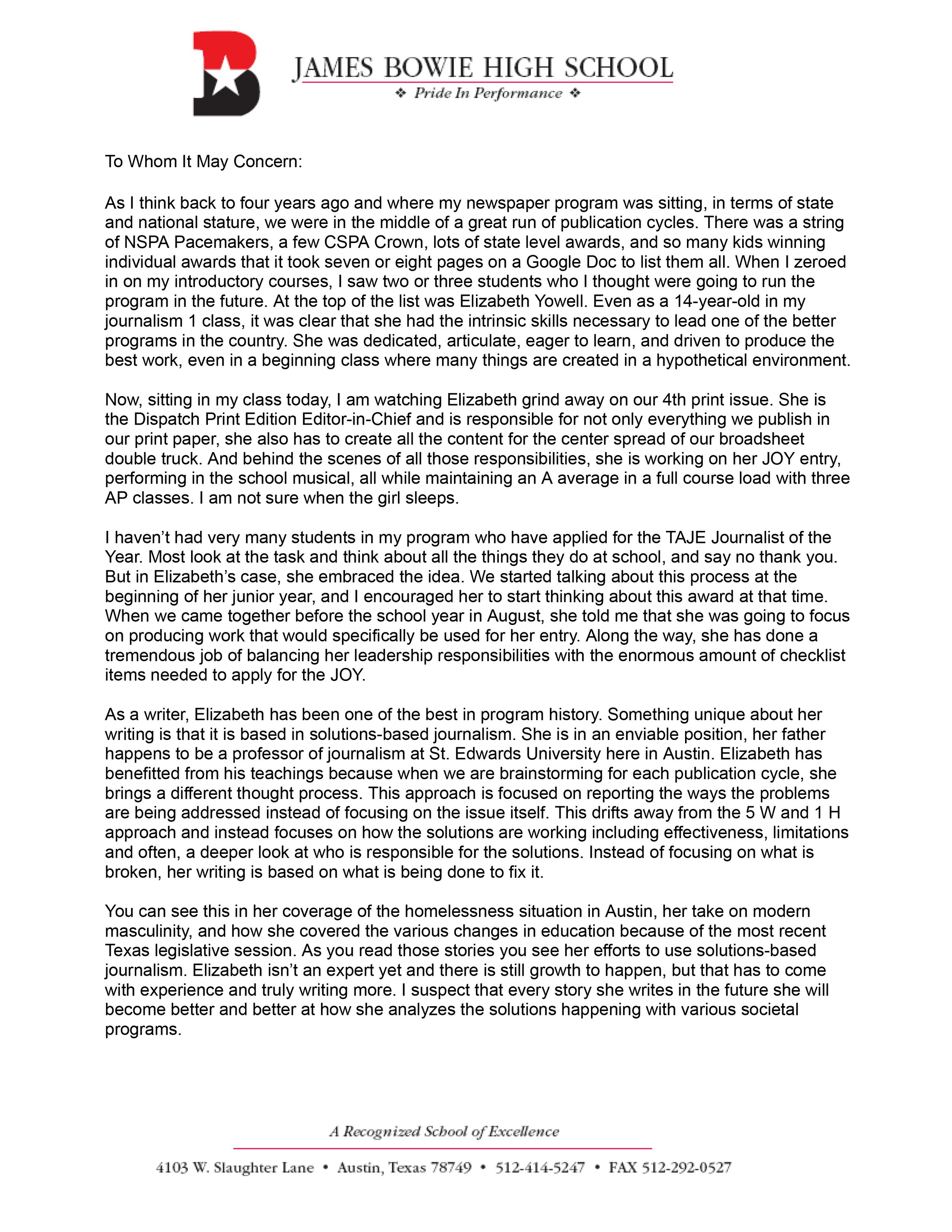 Elizabeth Yowell, Student Journalist